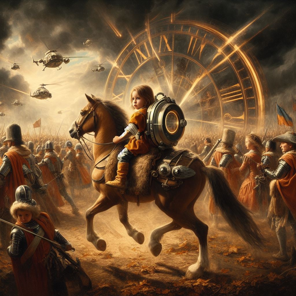 AI created image by Bing using the prompt: Create a painting in the style of Rembrandt showing time travel with a six year old girl to the battle of Bosworth