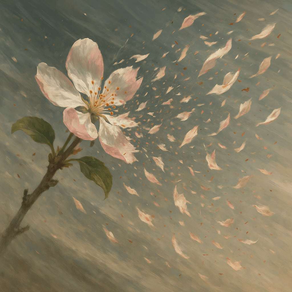 AI generated picture of apple blossoms ravaged by wind